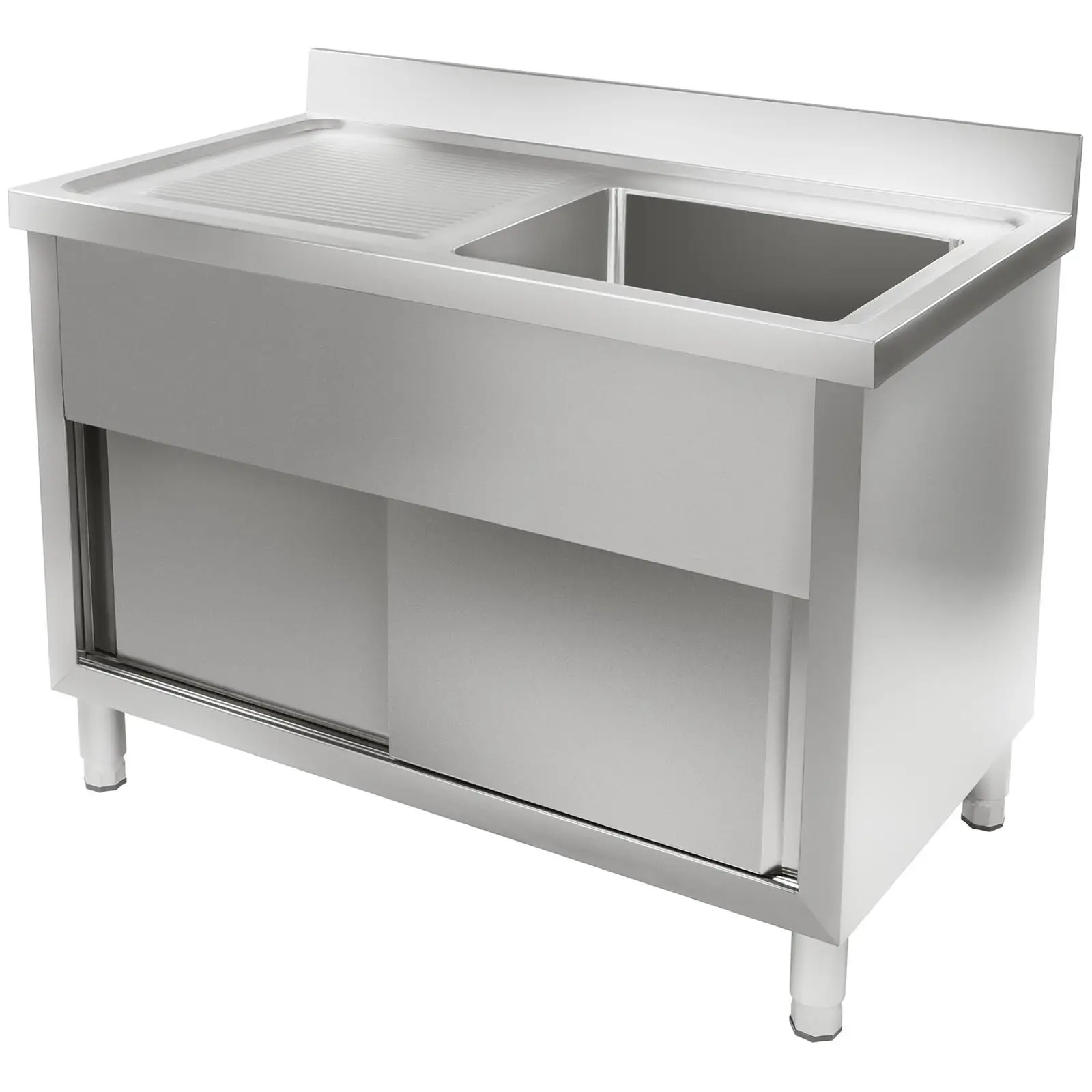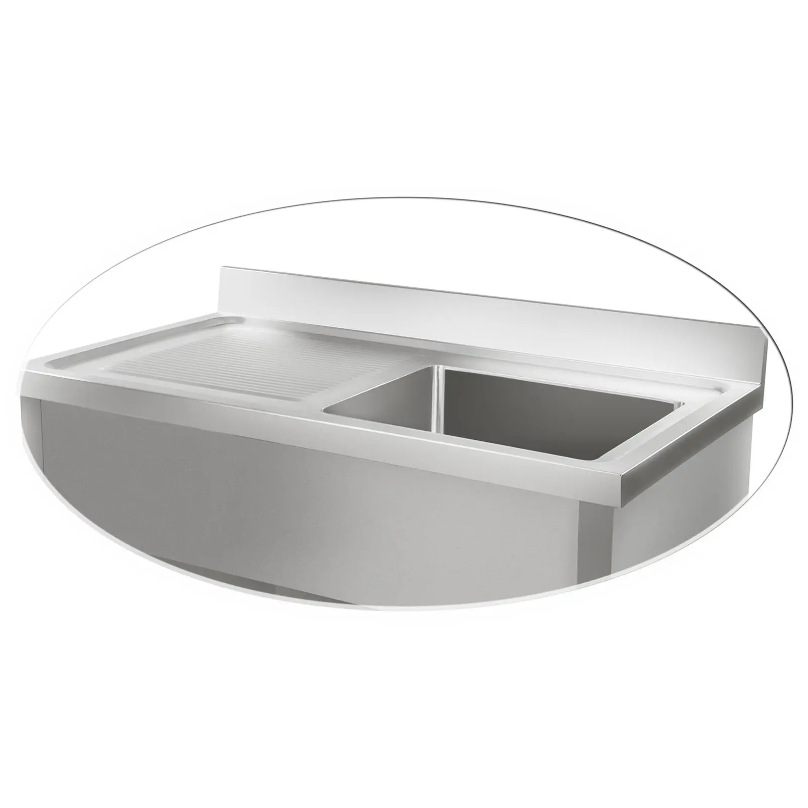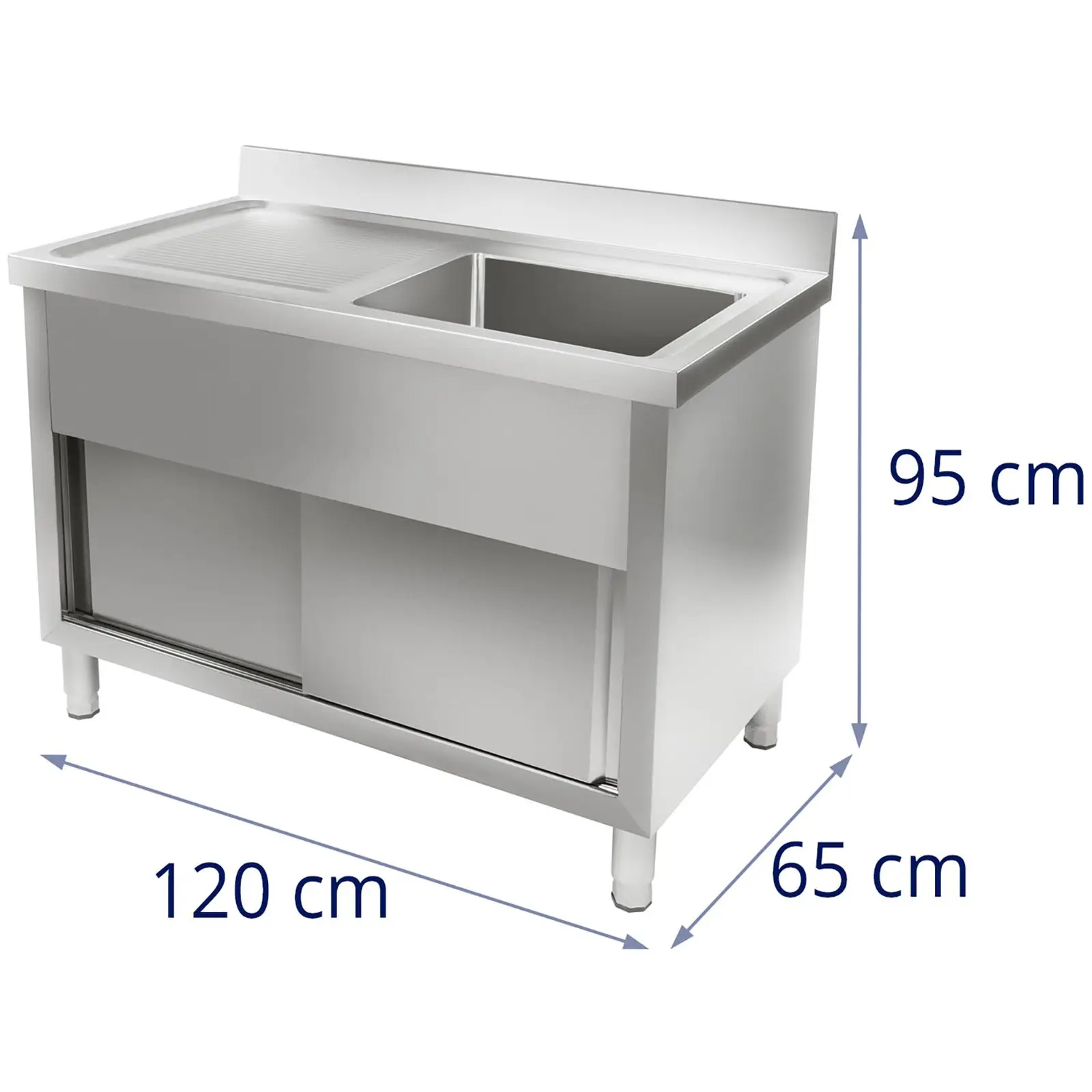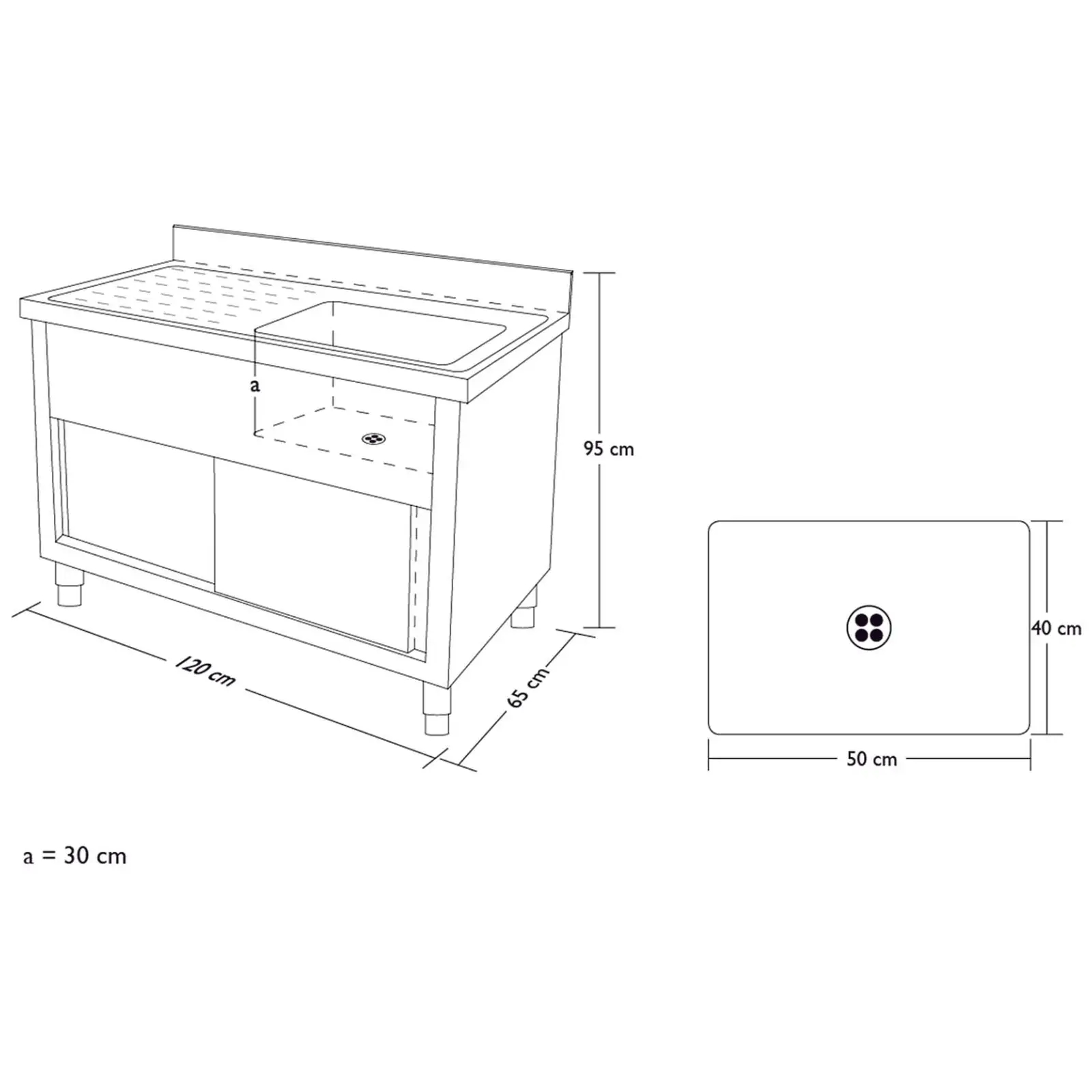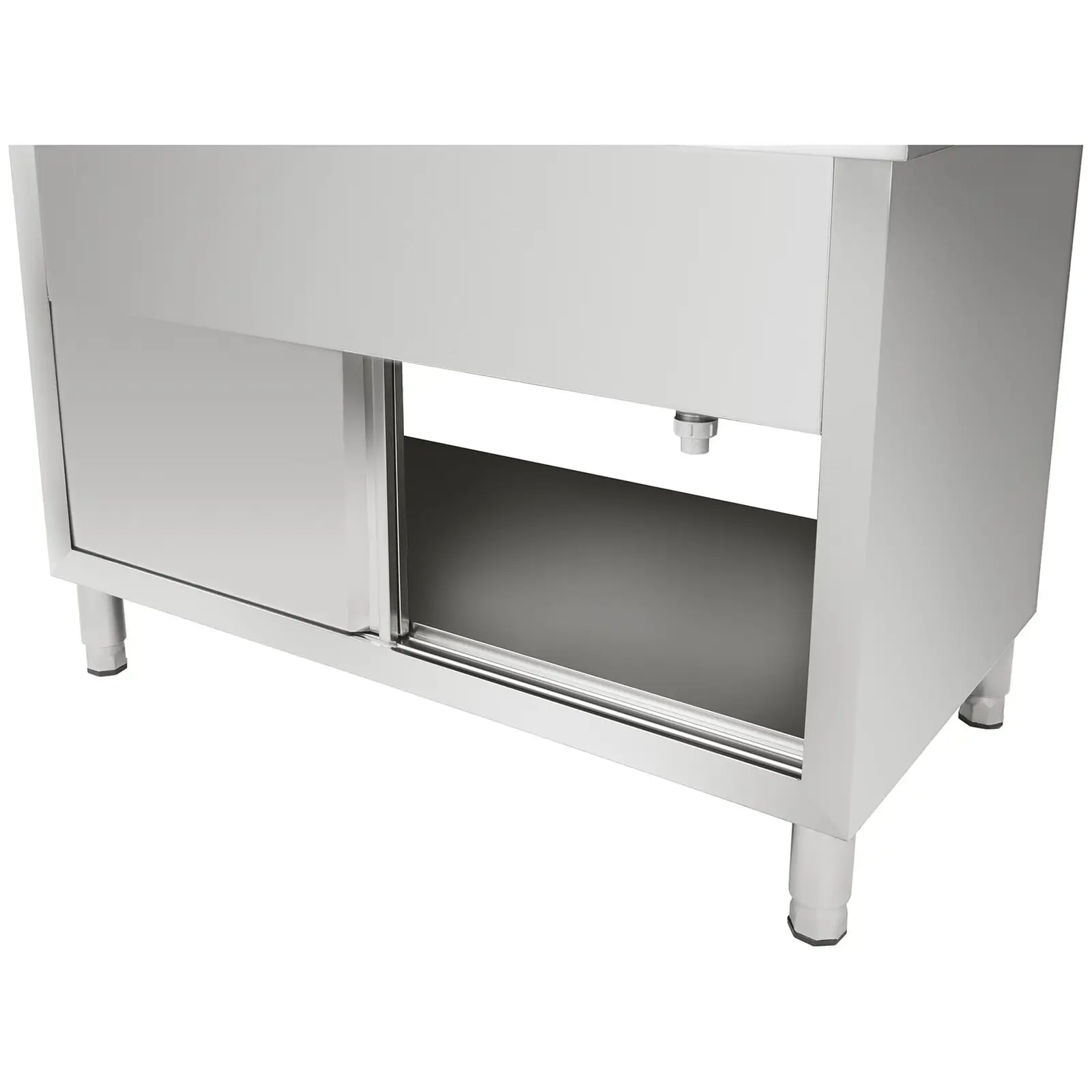 The kitchen unit RCHS-1200WS offers the perfect working surface for washing food, cleaning dishes of any kind and storing various utensils. The steel kitchen unit supports workers in restaurants, hotels, bars or canteens, as well as catering services. The unit has a sink, 2 sliding doors and a drip surface. It is a good addition to any kitchen.